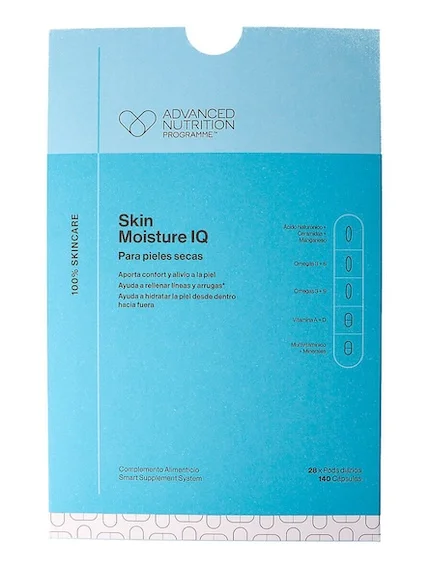 El suplemento Skin Moisture IQ de Advanced Nutrition Programme se ha creado mediante una composición especial para pieles secas. Cuenta con ácido hialurónico, ceramidas, ácidos grasos omega-3, ácidos grasos omega-6, vitamina A, vitamina D y un complejo multivitamínico que ayuda a hidratar la piel desde dentro. Y además, rellena las arrugas y las finas líneas de expresión del rostro.