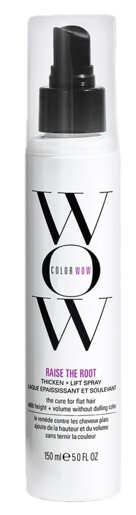 Raise The Root de Color Wow. Spray lifting ultraligero para revestir y engrosar el cabello que carece de volumen. utiliza «elastímeros» transparentes patentados que forman un «resorte» en la raíz. Además, el filtro UV ayuda a preservar el color y proteger el cabello. Puede usarse en cabello húmedo o seco.
