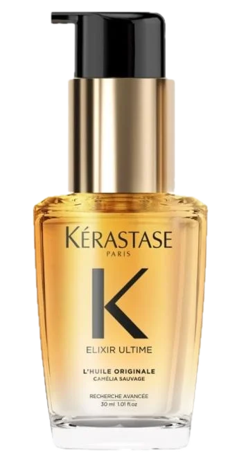 Elixir Ultime Oil de Kérastase. Formulado con una exclusiva fórmula enriquecida con extracto de Camelia francesa, este aceite icónico es la solución perfecta para todo tipo de cabello. Aumenta el brillo y la suavidad de manera instantánea. Además, el pelo se vuelve más manejable y fácil de peinar. Su ligera textura garantiza una absorción rápida y un tacto suave. Su fragancia combina notas de mandarina, fresia, madera de cedro y sándalo.