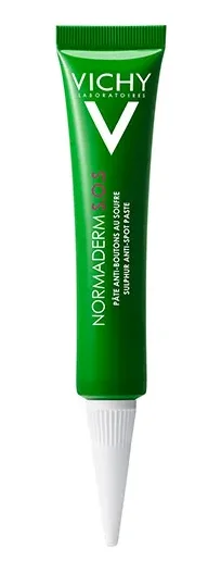 El corrector facial de manchas Normaderm S.O.S de Vichy Laboratoires es un tratamiento anti-acné que actúa por la noche secando los granos y calmando la piel. Contiene activos dermatológicos de origen 100% natural. Por una parte, azufre para secar las espinillas aportando un efecto antibacteriano. Y por otra, ácido glicólico que exfolia y purifica la piel y extracto de aloe vera con propiedades calmantes.