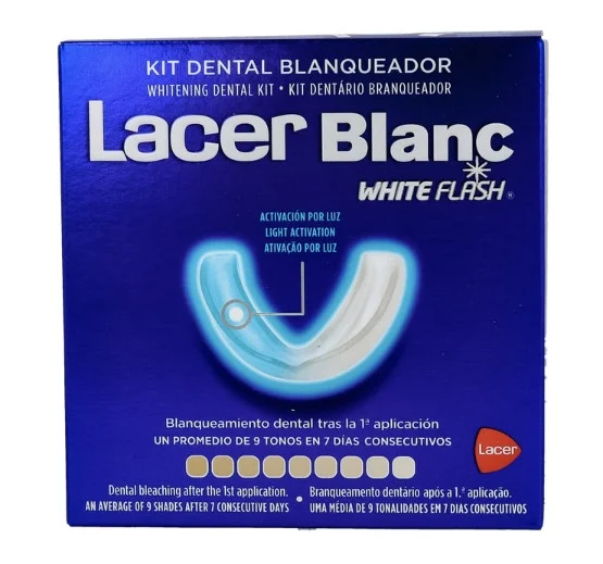 El kit blanqueador dental Lacer Blanc White Flash de Lacer incluye una férula dental fotoluminiscente y un gel dental blanqueador. Este último contiene percabonato sódico que se activa con la luz de la férula, blanqueando los dientes un promedio de 5 tonos, después de 7 aplicaciones consecutivas (máximo 1 por día).