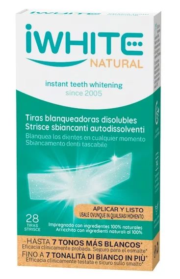 Las tiras blanqueadoras de iWhite son disolubles y se pueden usar fácilmente en casa, en el trabajo o mientras se viaja. Tienen una buena adherencia y, tras ser aplicadas, se deja que se disuelvan en 15 minutos. Utilizan tecnología PAP, una molécula de acción blanqueadora eficaz sin peróxido de hidrógeno.