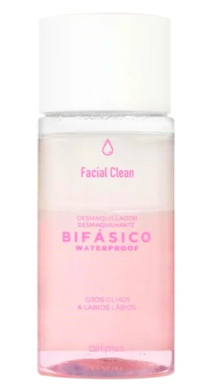 El desmaquillador Waterproof Facial Clean de Deliplus es un producto bifásico para ojos y labios. En el caso de los ojos es recomendable para desmaquillar máscaras y extensiones de pestañas que sean resistentes al agua. Se aplica con discos desmaquillantes, se deja actuar 30 segundos y se quita con cuidado.