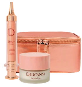 Este bonito neceser en color oro rosa guarda uno de los tesoros de D’Lucanni: el sérum efecto bótox-like BTX10 que suaviza arrugas y líneas de expresión. Está formulado con un neuropéptido que aumenta la firmeza de la piel y reduce las arrugas actuando en zonas tan problemáticas como las “patas de gallo”, el surco nasogeniano o el temido «código de barras». Lo acompaña una crema efecto lifting perfecta para tratar los signos de la edad y dejar la piel más firme, elástica y luminosa.