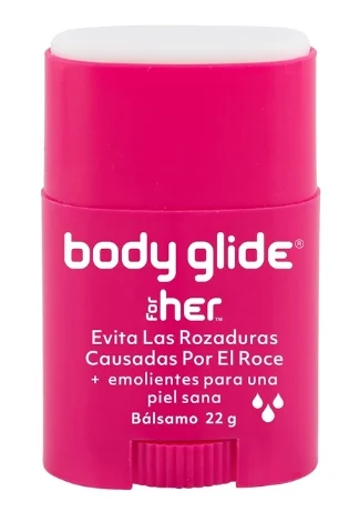 Bálsamo antirozaduras Body Glide For Her. Este bálsamo destaca por su formato en stick, muy cómodo de aplicar y perfecto para llevar en el bolso. Su fórmula vegana incluye alantoína, aceite de coco y almendras dulces, creando una barrera invisible que protege frente al roce. Es resistente al agua y al sudor, no tiene perfume ni deja sensación grasa.