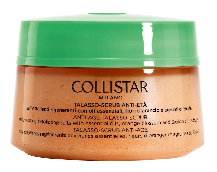 La crema Talasso-Scrub Antiedad de Collistar incluye en su composición tanto sales minerales exfoliantes regenerantes como aceites esenciales, azahar y cítricos sicilianos. De este modo, combina talasoterapia y aromaterapia. Es ideal para antes de tratamientos especializados porque vuelve la piel más receptiva. También antes del sol y de autobronceadores para conseguir un color más uniforme y duradero. Y después del sol porque elimina los efectos de la descamación cutánea.